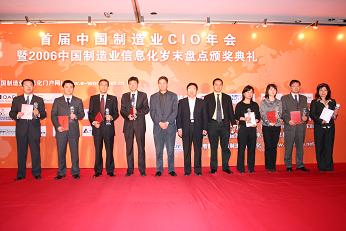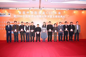 本网讯 2007年3月16日,主题为"信息化托起制造业创新之魂"的"首届中国制造业CIO年会暨2006中国制造业信息化岁末盘点颁奖典礼"在京隆重举行。来自国内外的上百家制造业信息化专业厂商和百余家制造企业的CIO及信息化相关负责人400多名嘉宾出席了本次年会。在年会上隆重揭晓了"2006中国制造业信息化年度人物"、"2006中国制造业杰出及优秀CIO"、"2006中国制造业"信息化支撑管理创新最佳及优秀实践"、"2006中国制造业信息化优秀供应商"、" 2006年中国制造业信息化优秀推荐产品"等十三项奖项。