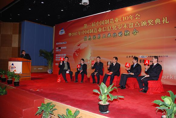 来自成都王牌汽车集团股份有限公司总工程师刘述雅、天狮集团副总裁阎玉朋、天津汽车模具股份有限公司副总经理常世平、长飞光纤光缆有限公司IT经理查玉峰、天津柯雅美术材料有限公司IT经理吴文琦 围绕制造业管理变革与信息化深化应用等问题展开讨论,并就相关热点展开是非博弈。来自杭州摩托罗拉移动通信设备公司CIO王波、中信重型机械公司信息管理中心主任王乃周、四川空分设备(集团)有限责任公司CIO龙定羽、山东南山集团精纺总厂CIO宋杰、重庆利时德控制拉索系统有限公司管理信息部部长梁绍均围绕信息化的价值与IT部门的发展展开讨论。