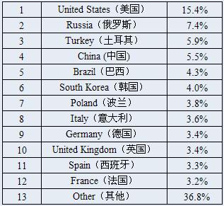 2008年第一季度12个最大的垃圾邮件输出国名单如下: