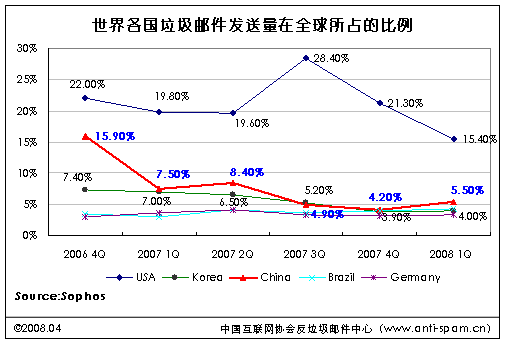 Sophos最新发布的研究报告,披露了2008年第一季度发出垃圾邮件最多的12个国家。同时调查发现2008年第一季度所发送的邮件中,垃圾邮件的比例达到了92。3%。此外,在2008年第一季度,Sophos每天平均可以发现多达23,300个和垃圾邮件有关的网页,即每三秒钟就增加一个垃圾网站。