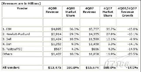 排名第二位的惠普收入是39亿美元,比07年同期减少了10%。DELL的收入是14亿美元,也减少了10%。SUN公司收入为13亿美元,缩减了14%。富士通/富士通-西门子公司的服务器收入也下滑了15%。