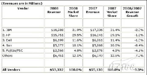 根据IDC,整个2008年,IBM也继续保持了全球服务器收入领先地位,达到170亿美元,但比07年减少了2%。HP的收入为158亿美元,也减少了大约2%。戴尔的收入为62亿美元,下滑1%。SUN公司为54亿美元,减少8%。富士通收入26亿美元,减少4%。
