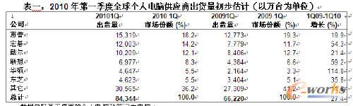 联想在2010年第一季度出货量增长了59.2%。尽管联想高度依赖中国市场的情况依然未变,但其拓展消费品市场的承诺已显成效。华硕在第一季度的出货量增长了114.8%,首次加入世界排名前五的行列。该公司于2008年通过发布迷你笔记本电脑而迅速扩大市场份额,但该公司也成功地拓展了其在传统的笔记本电脑市场的份额。