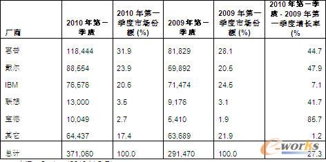表二:亚太区:2010年第一季度服务器厂商收入预计(单位:台)