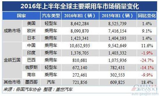 根据全球各国汽车行业组织公布的数据,盖世汽车研究院盘点了2016年上半年各国的汽车销量情况。