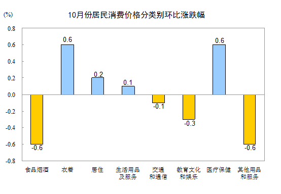 10月份,其他七大类价格环比四涨三降。其中,衣着、医疗保健、居住、生活用品及服务价格分别上涨0.6%、0.6%、0.2%和0.1%;其他用品和服务、教育文化和娱乐、交通和通信价格分别下降0.6%、0.3%和0.1%。