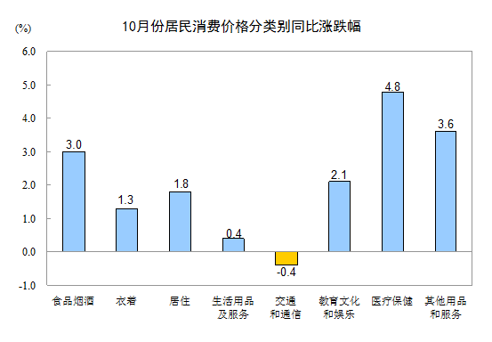 10月份,其他七大类价格同比六涨一降。其中,医疗保健、其他用品和服务、教育文化和娱乐、居住、衣着、生活用品及服务价格分别上涨4.8%、3.6%、2.1%、1.8%、1.3%、0.4%;交通和通信价格下降0.4%。