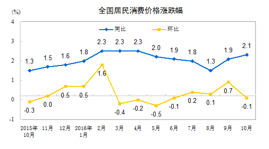 2016年10月份,全国居民消费价格总水平同比上涨2.1%。其中,城市上涨2.2%,农村上涨1.8%;食品价格上涨3.7%,非食品价格上涨1.7%;消费品价格上涨1.9%,服务价格上涨2.5%。1-10月平均,全国居民消费价格总水平比去年同期上涨2.0%。
