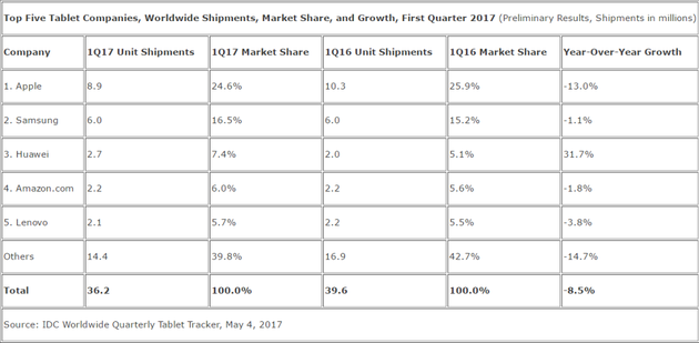 IDC的统计中包含了单纯的平板电脑(自2014年开始出货量就在滑坡)和可作平板电脑使用的变形本(出货量略微上升)。这意味着,带键盘的平板电脑也在统计之中。前两大平板电脑厂商仍然维持着领先地位:苹果排名第一,而三星紧随其后。前五大厂商的市场份额总和为60.2%,高于去年同期的57.3%。而没有任何一家厂商的出货量超过1000万台。