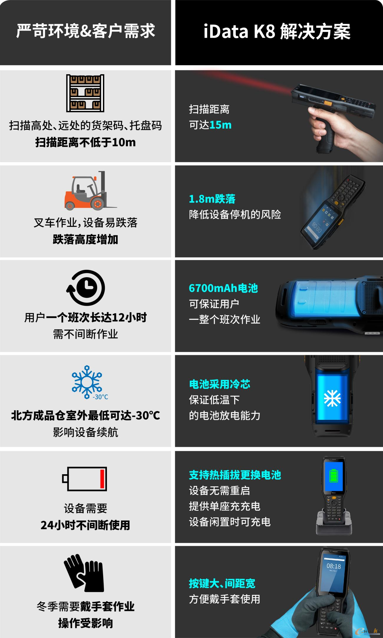 目前该企业全国多地的成品仓均采用iData K8数据采集终端,极大地提升了用户的作业效率及成品仓数字化管理能力。