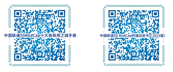 欢迎扫描下载《中国联通5G RedCap十大首商用之城手册》、《中国联通5G RedCap终端白皮书(2023版)》。