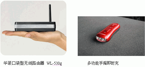 活动期间,凡购买华硕54M口袋型无线路由器WL-530g(价值566元),即可获得价值89元的5dBi 全向天线一支和价值168元的可为手机物理充电的多功能手摇即时充手电筒一把。以华硕一贯塑造的高品质、高性能来说,此次促销组合相信会成为不错的无线网络应用之选!另据最新透露,一直以黑色主打的54M口袋型无线路由器WL-530g不久将会推出一款珍珠白色产品,特别适合配合简约风格的家居装饰。