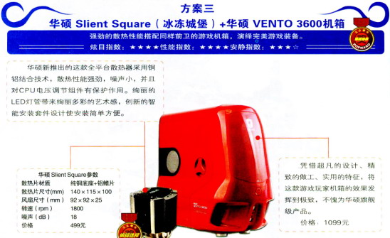 此外,在《大众硬件》最新的暑期中高端散热器方案的评测中,华硕Slient Square(冰冻城堡)+华硕VENTO 3600机箱在为游戏发烧友设计的散热解决方案中,一举夺魁,获得“编辑推荐奖”