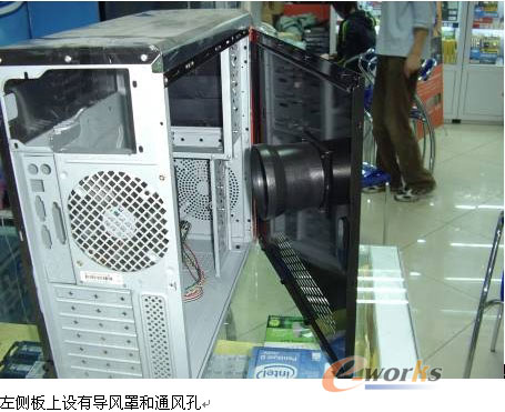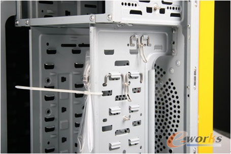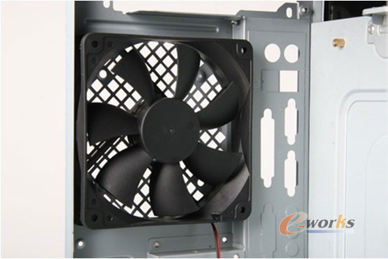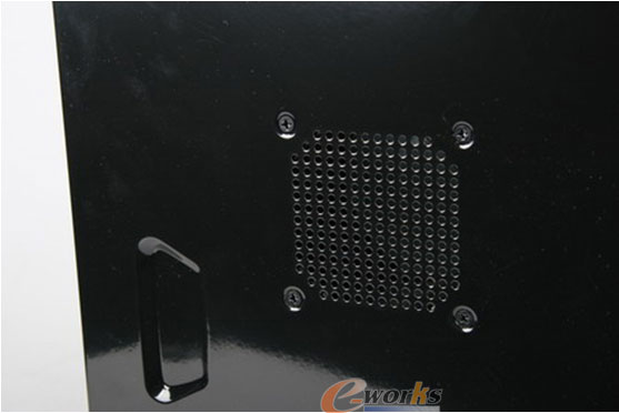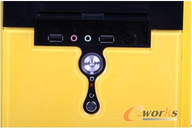 前面板上还设有两组USB接口、两组音频接口前置扩展接口,位于机箱前面板的中下位置,而电源开关和复位键则在USB前置扩展接口下方,不管将机箱放在桌上台下,这个位置都方便使用。
