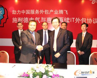 本网讯 2007年12月11日,施耐德电气与中国惠普签订了为期三年的IT外包服务协议。三年前双方首次签署IT外包合作协议,这次合作是继上次合作期满之后的首次续约。惠普全球副总裁、中国惠普总裁符标榜与施耐德电气总裁杜华君,以及中国惠普TSG全球IT科技服务部总经理潘家驰,施耐德电气大中国区IT总经理李总等双方高层悉数到场,力挺此次合作。