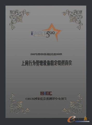 2008年3月22-23日,第五届中国企业信息化500强大会在京召开,评选出了在2007年度企业信息化建设中取得卓越成效的企业,以及为企业信息化建设做出突出贡献的产品提供商,并举行了颁奖仪式。工商银行、上海通用、中国远洋、中国石油、国家电网等著名企业名列500强榜单,SAP、EMC、用友、网康科技、东软等厂商则获得了最佳用户选择奖,其中北京网康科技有限公司同时荣膺“最佳上网行为管理产品”和“中国企业信息化500强上网行为管理设备指定提供商”荣誉,成为此次大会的亮点之一。