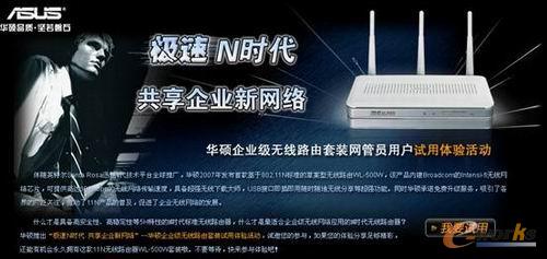 随着802.11n 的产业化,无线技术的又一大进步,使得无线应用得到了广泛扩展,这种扩展不仅体现在个人领域,更多是为中小企业的网络应用扩展了新的平台。近期一项针对企业级802.11n无线网络应用的大型试用活动正在如火如荼的进行中。该活动由无线网络产品居全球第一的华硕电脑独家推出,活动期间所有有志为企业无线网络做出贡献的网管员均可报名参加,取得试用资格后华硕将为您提供802.11n旗舰产品高速无线路由器WL-500W和无线网卡WL-100W组合套装(详情请见www.asus.com.cn)。