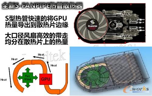 这款散热器名为S-Fanpiple,顾名思义就是使用了一条S形的长热管,将GPU发出的热量均匀的导出到散热片的边缘,使得散热器热量分布更加均匀,然后大口径风扇的出风就能够以最高效率带走热量,整个风道畅通无阻,还能够辅助供电模快散热。