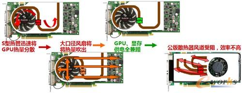 丽台S-Fanpiple和NVIDIA公版散热器相比,两者都是单槽散热器、都完全覆盖了GPU和显存的散热器,都支持温控风扇调速功能。但是NVIDIA公版散热器无论从风道设计、风扇口径还是散热片面积方面,都不如丽台S-Fanpiple散热器。经过实际测试来看,丽台全新的S-Fanpiple散热器不仅能够让GPU工作温度更低、而且噪音更小,可以说是目前效率最高的单槽散热器。
