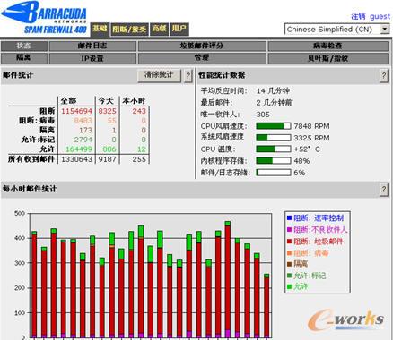 梭子鱼以图表等不同的形式给出了系统处理邮件的状态报告,包括邮件日志统计数据库,每小时邮件流量统计图,每日邮件流量统计图,系统运行状态报表,每日不同类型邮件排行榜及图表等。
