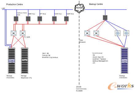 中国航信信息系统分布在同城的两个节点——生产中心及备份中心,两地相距10公里。生产中心节点主要包含运价系统、数据库及中间件、电子商务、WWW服务等,备份中心节点运行着电子商务应用、数据库、行李分拣应用数据库、备份管理等应用。
