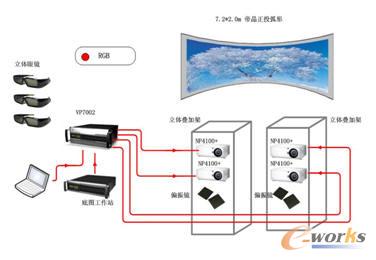 从现场上看,置放在两个立体叠加架上的4台NEC NP4100+工程投影机,结合4片偏振镜及VP7002、底图工作站实现了特殊片源在7.2×2.0M弧形屏幕的3D投影。强大的弧形幕校正及双机叠放,使此次展示的NEC 投影机3D立体解决方案明显优于传统的3D投影机解决方案。以NEC NP4100+工程投影机为主体的立体投影解决方案,为3D公众展示场所提供了更好的选择。