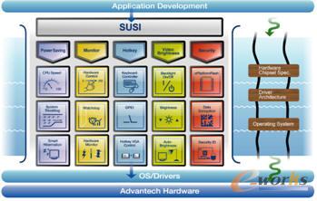 另外在中介软件方面,研华则推出了SUSI (安全和统一智能接口),SUSI是一组用户友好的、智能的集成应用编程接口,可以缩短开发时间、增强安全性,并为研华平台用户提供了附加价值。 SUSI 使应用的创建、操作和升级都变得更为简单、快捷。SUSI的功能主要包括节能、监控、热键、视频亮度 、安全性等。