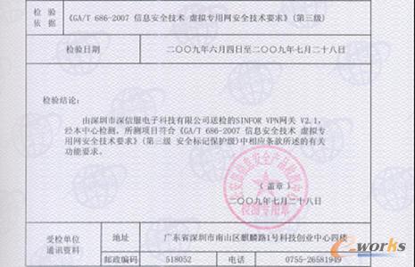 此次送交公安部计算机信息系统安全产品质量监督检验中心测评的VPN产品中,包括众多国内主流VPN厂商和欧美知名厂商的产品,必须经过及其专业、严格的测试才可获得通过;在评测过程中,深信服VPN网关在标识和鉴别、安全和审计、通信抗抵赖、自主访问控制、隐蔽信道分析等评测环节中表现出色,受到评测专家的高度好评,成为第一个通过公安部“GA/T 686-2007(三级)”标准的VPN产品。