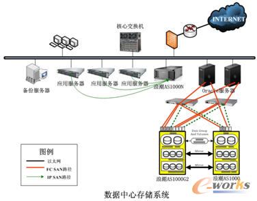上图中,Oracle数据库服务器通过冗余FC SAN访问浪潮光纤磁盘阵列AS1000G2,AS1000G2可与另一台AS1000之间实现数据镜像,从而获得了数据的多个副本,数据的安全得以保证。而其它应用服务器则通过IP网络将数据存储在浪潮AS1000N网络存储中,AS1000N支持万兆网络连接,最多可支持10个千兆网络接口聚合,从而具有GB级的存储带宽。这样,不同的数据在物理上就分离了,分层存储可以做到使用最合适的存储协议和存储设备来存储相应的数据类型,从而达到投资效率的最大化。