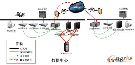 上图中,在容灾中心同时配置另外一台AS1000N,这两台AS1000N之间配置IP链路。首先使用备份软件定期将数据中心应用服务器和数据库服务器中数据备份到本地AS1000N中,然后通过AS1000N的远程数据IP复制功能将备份数据传输到容灾中心AS1000N中。在容灾中心,可以通过备份软件将备份数据恢复到应用服务器和数据库服务器中,实现数据重现和应用的恢复。
