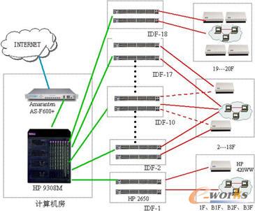 考虑到旺旺大酒店的网络终端用户的应用需求,HP ProCurve设计了建议的网络方案为高带宽网络方案。配置一台具有第三层交换能力的核心交换机,共同处理各楼内部的交换和路由,并通过千兆技术将核心交换机用1G的带宽与每个楼层配线间的交换机或交换机堆叠用千兆连接连到核心交换机,形成千兆主干。