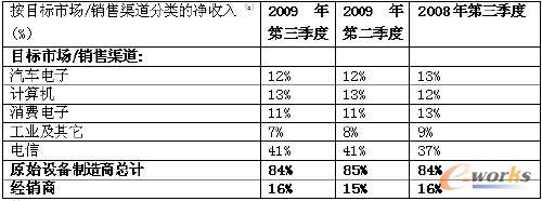 2009年第三季度意法半导体净收入总计22.75亿美元,包括并入意法半导体的ST-Ericsson的销售收入。净收入环比增长14%,反映了市场需求在意法半导体的所有目标市场上以及所有地区市场上恢复增长,特别是亚太地区和大中国区的市场需求更加强劲。公司在欧美市场的收入重拾升势,反映了市场环境逐步回暖。因为商业环境不景气,除亚太地区市场以外,在所有的目标市场和地区市场上,第二季度净收入低于去年同期水平。