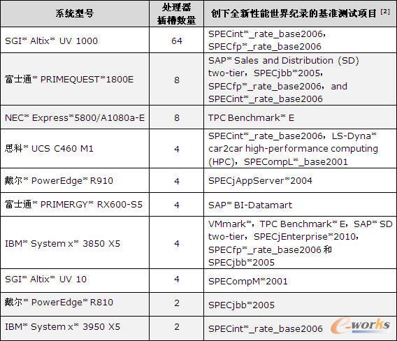 至强处理器7500 系列带来了至强® 处理器家族有史以来最大的性能飞跃,在广泛的性能基准测试中,其性能平均提升达到了3倍之多,并刷新了 20 多项性能世界纪录,这其中包括了来自思科*、戴尔*、富士通*、IBM*、NEC* 以及 SGI*的评测结果。