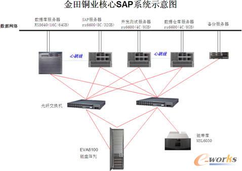 惠普秉承客户化的原则,充分考虑金田铜业客户的业务特点、业务流程、现有应用软件及其运行状况、现有IT架构及其利用情况等信息,为金田铜业提出了如下的解决方案:采用性能出众、高可靠、高可用的基于英特尔安腾2处理器的HP Integrity 动能系列服务器作为ERP的运行平台,服务器组成双机集群,互为热备,提高系统的高可靠性。同时,采用一台HP StorageWorks EVA8100企业级虚拟化磁盘阵列作为数据存储系统,实现数据集中、应用分散的目标,为下一步的数据容灾做好准备。