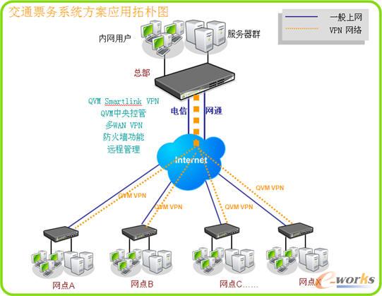 本方案重点在于解决稳定、快速且安全的远端互联并保证票务系统的稳定不中断。总部中心端采用侠诺中高阶QVM VPN产品,如QVM2050、QVM1250、QVM750等,并接入电信网通双线路;交通联网票分点则采用侠诺中低阶产品,如QVM250、QVM350、QVM450等,也现时备有任一ISP双线接入。因有Qno侠诺独有的QVM SmartLink VPN功能,只需设定IP位址、用户名及密码三个步骤就轻松搞定了分点与总部的SmartLink VPN的连网方案。