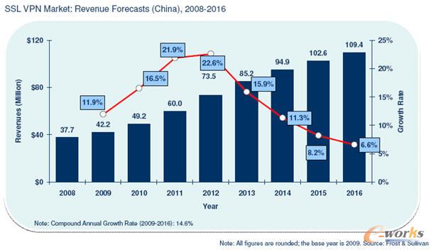 Frost的报告指出,中国SSL VPN市场虽然较上年预测的增长速度有所放缓,但由于中国地理分散的工作状况以及网络应用程序采用的快速增长,中国企业对SSL VPN产品的需求预计将在接下来的几年稳步上升。此外,随着中国企业对IT安全日趋成熟的观点深入,中国企业有可能驱动高科技市场如虚拟化和云计算的发展,这将有力增强SSL VPN技术的重要性,SSL VPN市场将在未来几年保持持续、稳定的增长。