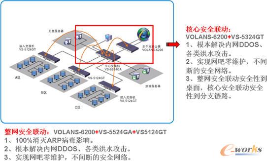 从上图中可以看到,飞鱼星ASN安全联动方案采取多WAN防火墙宽带路由器VR与防攻击安全联动交换机VS配合使用,构成分布式的安全控制网络架构,安全性可到达内网任何信息点。在本方案中,路由器与交换机不再是单独的个体,二者并轨而行,交互协作,共同构成一套完整的网络安全体系。适用于网吧、校园等对于内网管理需要较多的用户,特别对网吧用户来说,实现网吧零维护,效果非常理想。