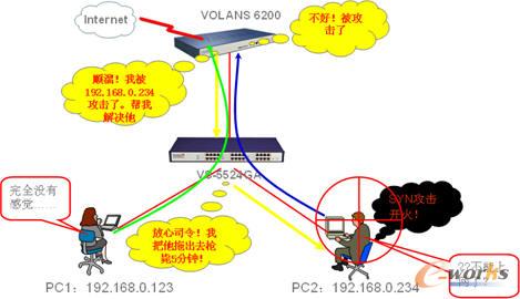 在防ARP病毒方面支持全网的IP+MAC+端口的一键绑定,VS交换机自动丢弃可疑的ARP欺骗报文,彻底解决ARP病毒的欺骗。如VR路由器发现内网有SYN FLOOD类的DDoS攻击,可自动调度VS安全交换机管制相应端口,惩罚屏蔽攻击源。同时,VR路由器将封锁机器狗病毒相关的危险网站,以阻止病毒发作。VS安全交换机通过识别病毒的网络特征,一旦检测到异常数据包,则直接丢弃,阻止病毒木马的传播。再加上VLAN区隔、访问控制(ACL)、风暴抑制和端口限速等功能,层层保障,全面确保整网的安全和稳定。