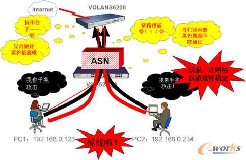 飞鱼星防攻击安全联动系统(ASN)一反传统的病毒防御方式,改变原来只靠路由器来防御病毒攻击的方式,采取VR路由器制定安全策略,在每个VS交换机端口上防御病毒攻击的方式,能够彻底解决网络病毒攻击问题。