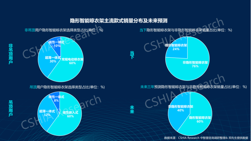 同时,经过CSHIA Research 中智盟咨询调研整理以及邦先生提供的数据,从当下来看,相比于隐形智能晾衣架,非隐形智能晾衣架的销量明显更高,占比约为76%,而隐形智能晾衣架的销量占比仅为约24%。但从长远角度来看,隐形智能晾衣架无疑有着更为迅速的增长速度和功能需求,未来三年,隐形智能晾衣架的销量占比将会得到稳步提升,并最终超过非隐形智能晾衣架,成为用户的首要选择。