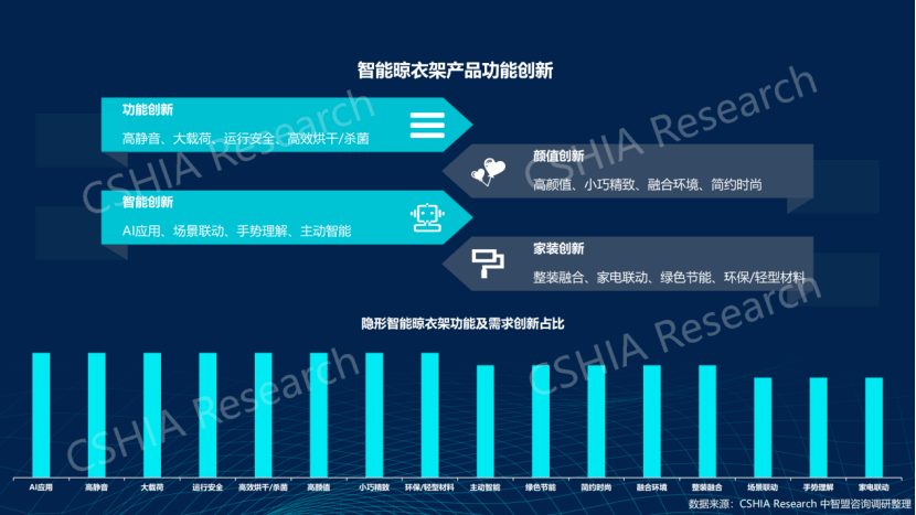 同时,CSHIA Research 中智盟咨询还对这些创新需求进行了深度调研,其中AI应用、高静音、大载荷、运行安全、高效烘干/杀菌、高颜值、小巧精致、环保/轻型材料等方向占比最高,是行业及用户关注的重要功能及产品创新。