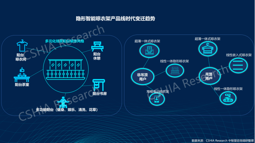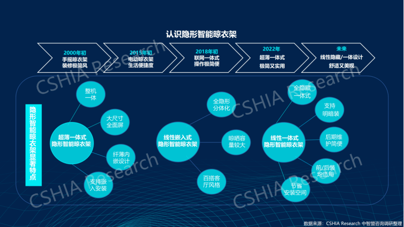 CSHIA Research中智盟咨询调研发现,隐形智能晾衣架演变背景较为复杂,但总体概述来说,从2000年初手摇晾衣架开始兴起,到2015年初电动晾衣架开始诞生,这期间,晾衣架逐步进入了千家万户,但面对人民群众对品质生活的追求,以及技术的不断创新,联网智能化的晾衣架成为行业发展趋势。从2018年初联网的智能晾衣架开始诞生,直到2022年,超薄一体式的产品逐步被用户追求,而到未来,线性隐藏以及一体设计的款式会并驾齐驱,也将逐步应用到千家万户。