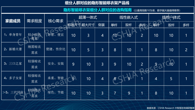 根据CSHIA Research中智盟调研整理总结,隐形智能晾衣架细分人群,根据家庭成员来细分的话,所对应的选购指南有所不同,我们以最高指数10为准,数字越大越值得推荐。通过对细分人群的划分,以家庭人员数为单位,随着家庭成员数量的增加,他们对大尺寸一体式晾衣架以及双杆隐形智能晾衣架的需求更高。同时,他们的核心需求也不局限于智能与性价比,而是追求更高的品质生活,这是由于隐形智能晾衣架能让生活更加融入家装环境。