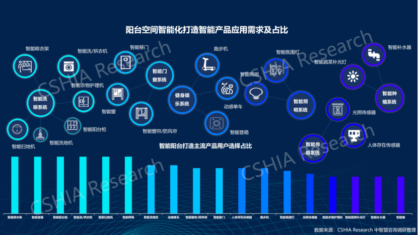 对此,CSHIA Research 中智盟咨询也这些智能阳台打造所需要主流产品进行了一次需求度调研,调研结果显示:智能晾衣架、智能音箱、智能阳台柜、智能洗/烘衣机、智能洗地机、智能扫地机、智能照明等产品是用户选择的首要智能产品,这也展现了目前智能阳台发展的重要方向。