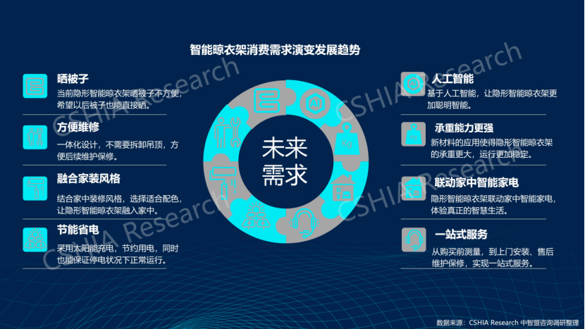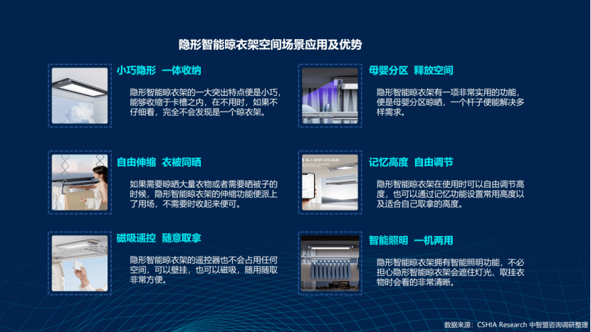 CSHIA Research中智盟咨询也调研了隐形智能晾衣架的发展时代变迁之路,从传统手摇到电动,从电动到联网智能,从联网智能到未来主动服务,成为晾衣架不断迭代的主因。特别是进入到AI 3.0时期,随着人们追求更高质量的品质生活,以及智能技术的不断迭代升级,隐形智能晾衣架逐步与人们日益增加的生活空间相融,为用户提供主动分析、绿色节能的服务。