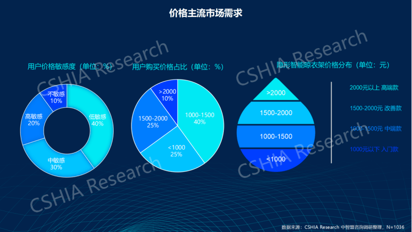 根据CSHIA Research中智盟咨询调研发现,在价格方面,消费者对于隐形智能晾衣架的价格相对较为敏感。因此,厂家更加注重产品的性价比,以满足消费者的价格敏感度需求。目前,各品牌对隐形智能晾衣架的价格定位主要集中在1000-2000元之间,相比之下,1000元以下的入门款和2000元以上的高端款在市场上的占比相对较少。而消费者对于隐形智能晾衣架的最终选购,也主要集中在这个价位。