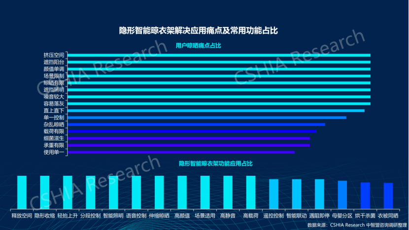 同时,针对非吊顶用户,适用于超薄一体式晾衣架、线性一体隐形晾衣架、常规电动晾衣架。吊顶用户可以购买超薄一体式晾衣架、线性嵌入式晾衣架、线性一体隐形晾衣架。根据CSHIA Research中智盟咨询调研发现,非吊顶客户选择晾衣架方式注重明装超薄一体式隐形智能晾衣架为主,而吊顶客户选择晾衣架方式是线性隐形智能晾衣架为主。