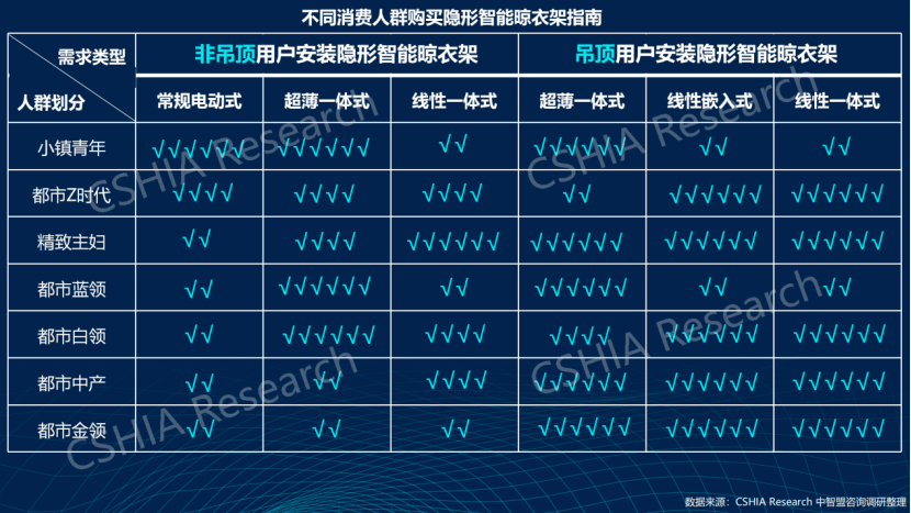 而针对吊顶和非吊顶用户,CSHIA Research中智盟也做了一些整理总结,根据隐形智能晾衣架的需求程度,将人群划分为小镇青年、都市Z时代、精致主妇、都市蓝领、白领、中产和金领等部分,随着不同人群对于生活品质的要求程度不同,他们对隐形智能晾衣架的需求也不同。