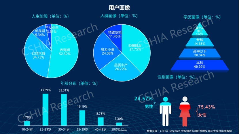 根据CSHIA Research中智盟咨询&邦先生提供电商数据调研整理发现,当前隐形智能晾衣架用户中,女性消费用户数量占比超过七成。从婚姻状态来看,已婚已育人士占据主导地位。从学历方面看,学历在专科和本科及以上的人群占据多数。在用户年龄方面,40岁以下的中青年用户比例超过八成,90后与95后的年轻一代日渐成长为绝对的主力消费群体。在具体人群画像中,轻奢靓女、品质中产、城乡小资和精致型男占比突出,隐形智能晾衣架对高收入、高消费群体的吸引力大,凸显出用户对于智能家居生活的高质量要求。
