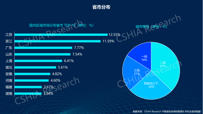 根据CSHIA Research中智盟咨询&邦先生提供数据调研整理发现,隐形智能晾衣架使用的最多区域主要包括江苏、浙江、广东、山东和上海等沿海省市,湖北、安徽和河南等中部省份区域使用人群较多。从城市等级来看,1-3线城市占比较高,随着城市等级的降低呈现明显递减趋势,智能晾晒需求与城市经济水平有着直接关系,四线及以下城市市场需求待引导与开发。